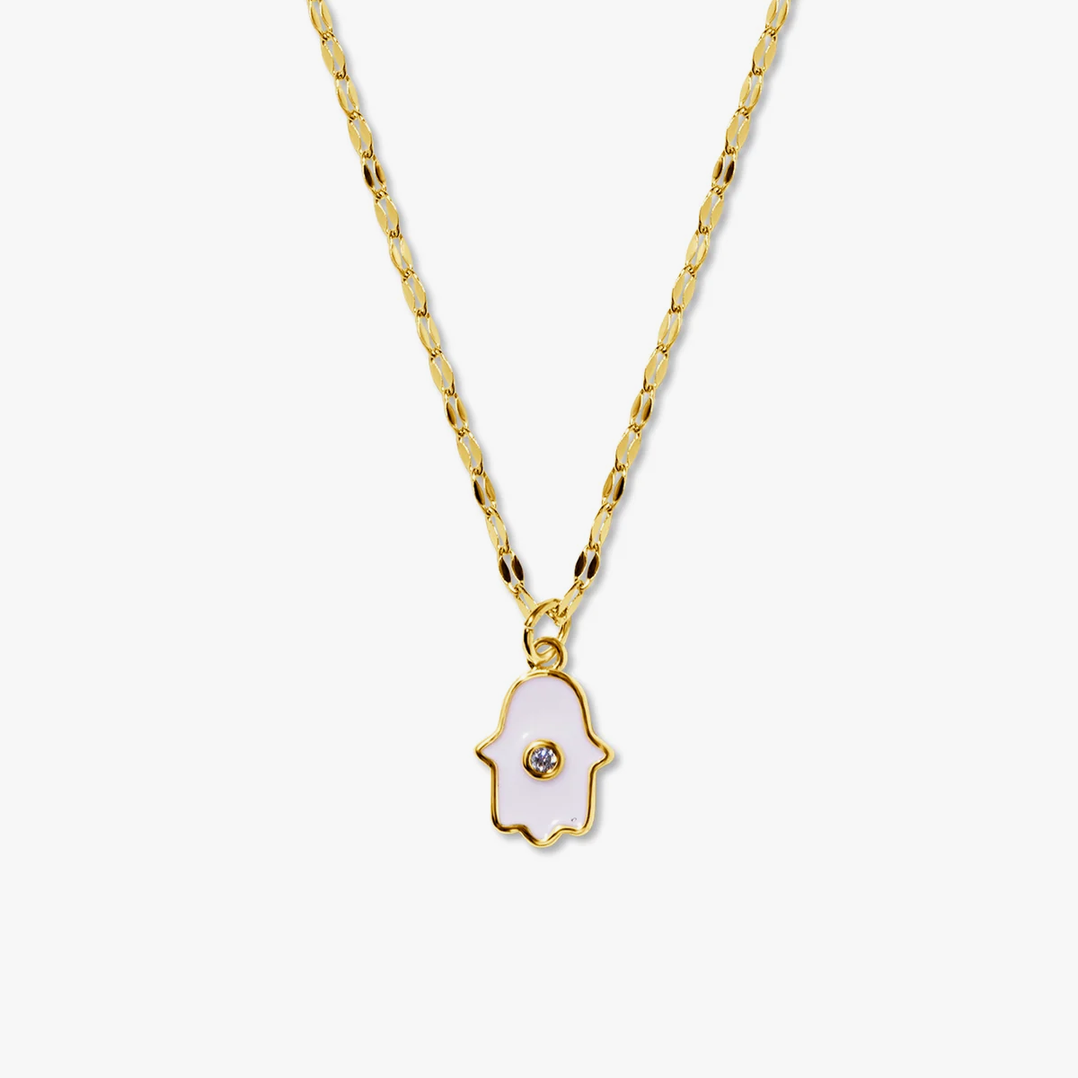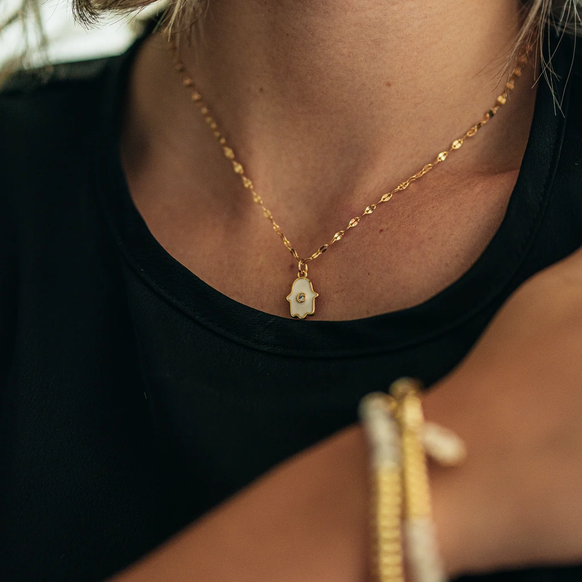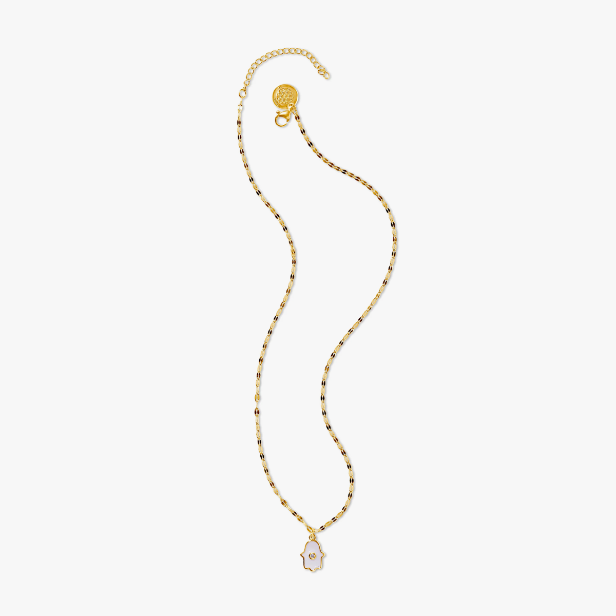 Avoid contact with water, perfumes, and lotions, which may affect the gold plating and the stones. Store in the pouch provided, in a cool place to prevent scratching and maintain the necklace's shine.
