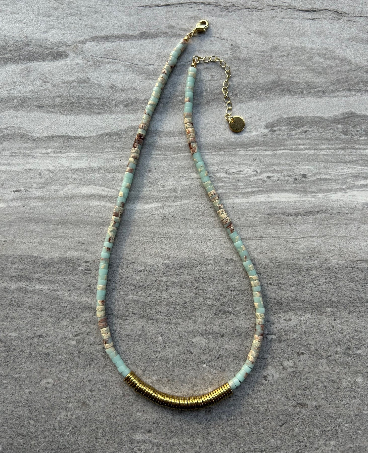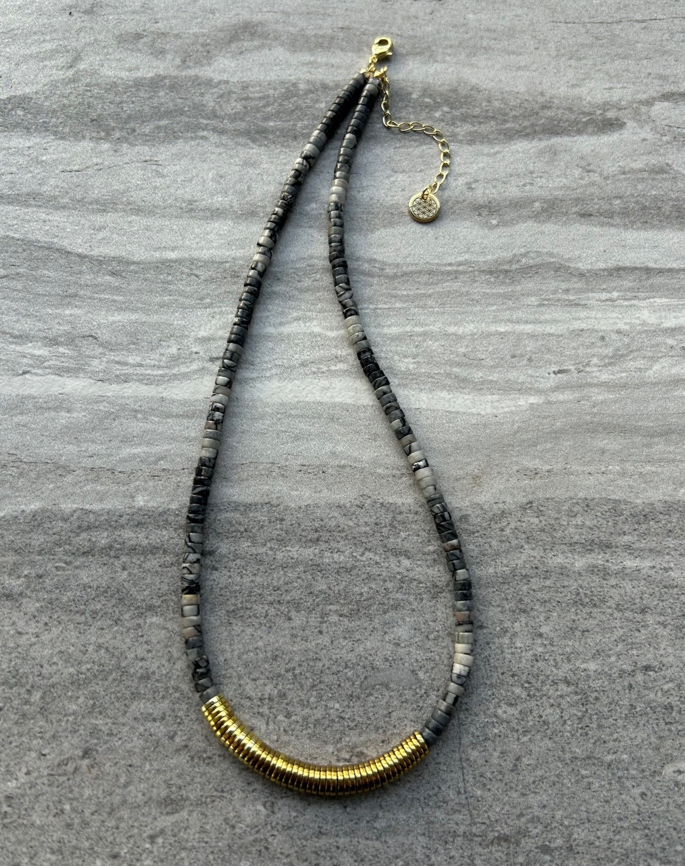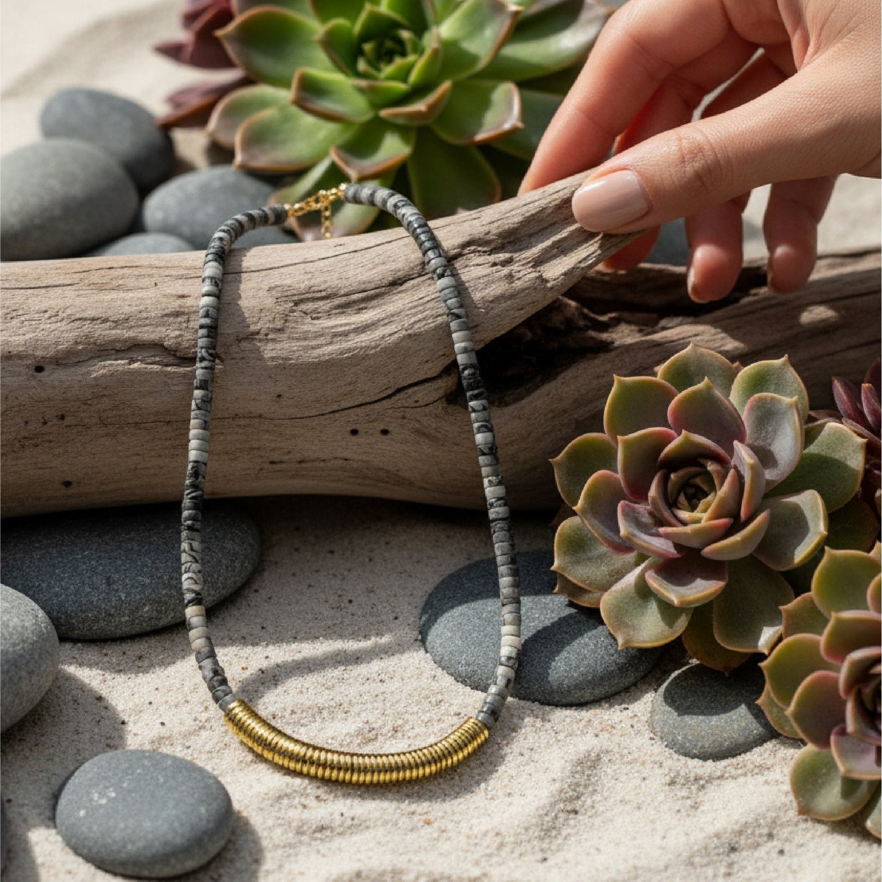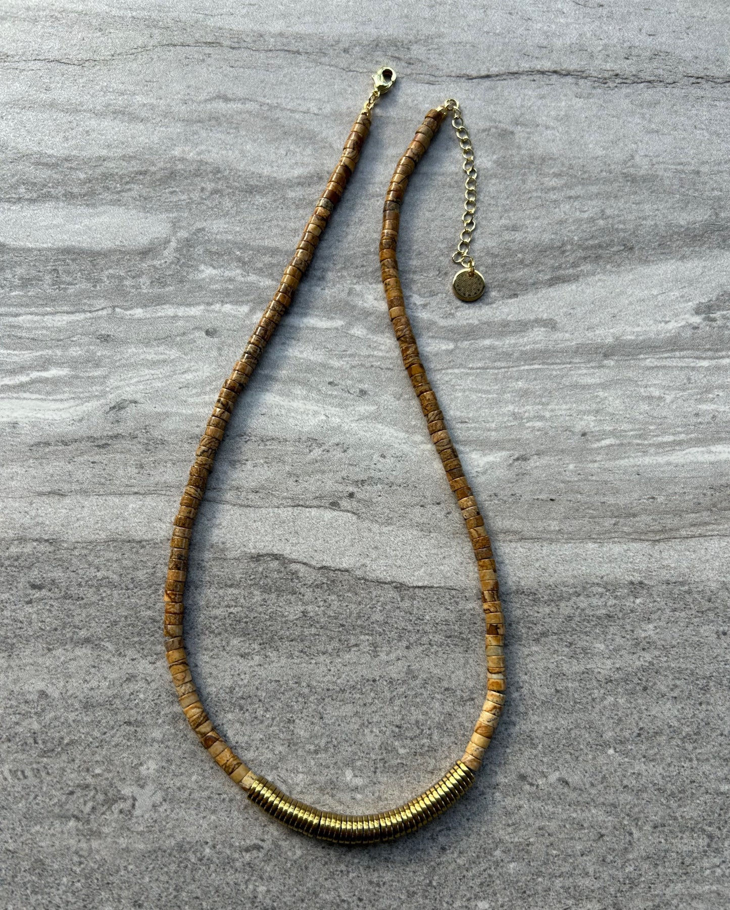 This minimalist collar-style necklace features a natural single strand of Picture Jasper heishi beads, known for their warm earth tones and landscape-like patterns that resemble natural scenery. The design is accented at the front with antique gold plated hematite heishi beads, adding a refined metallic contrast to the organic beauty of the stone.