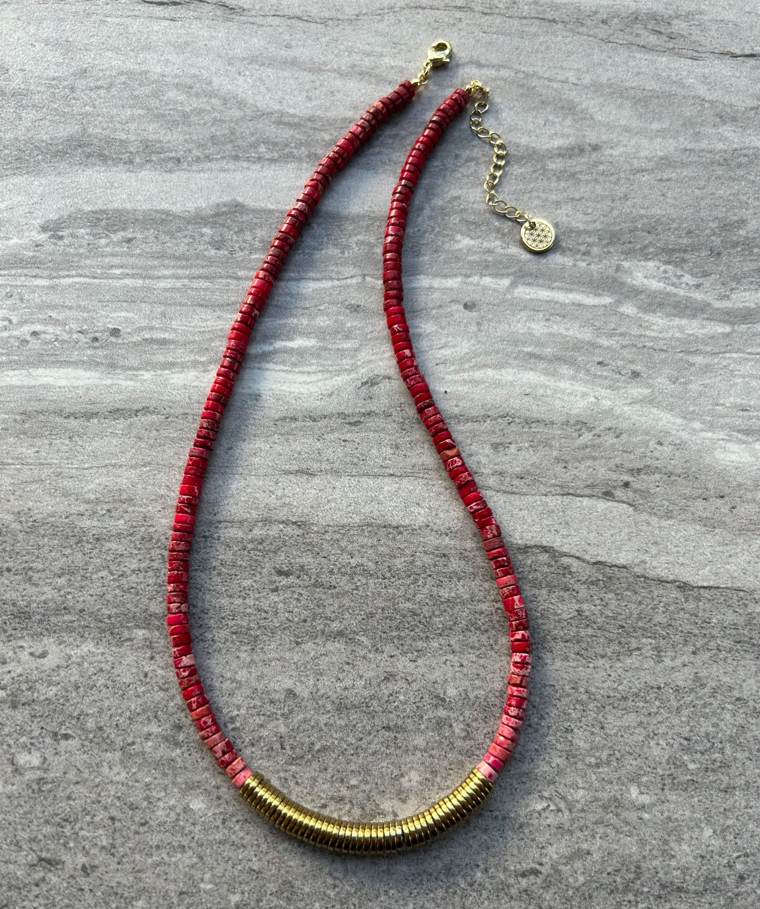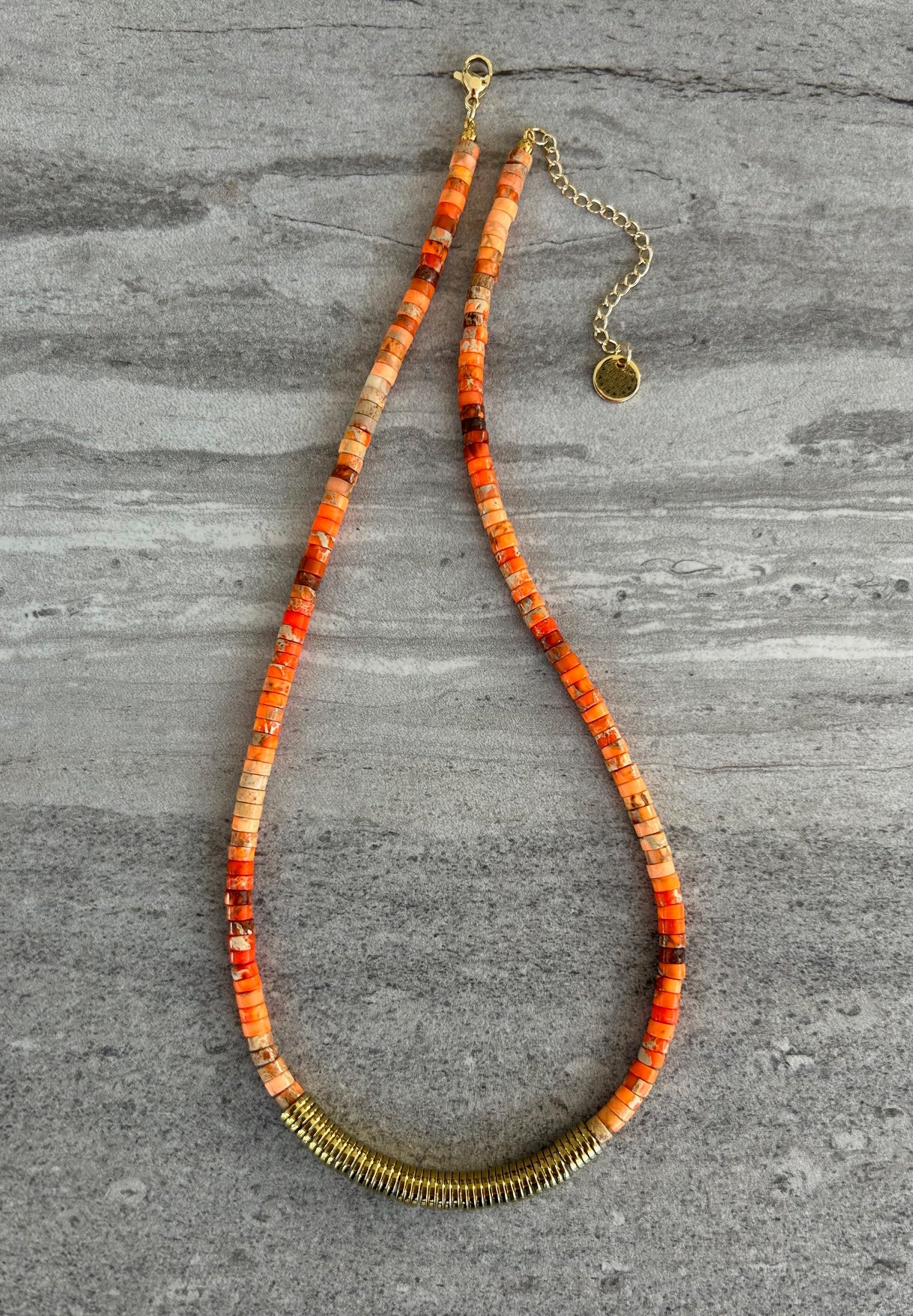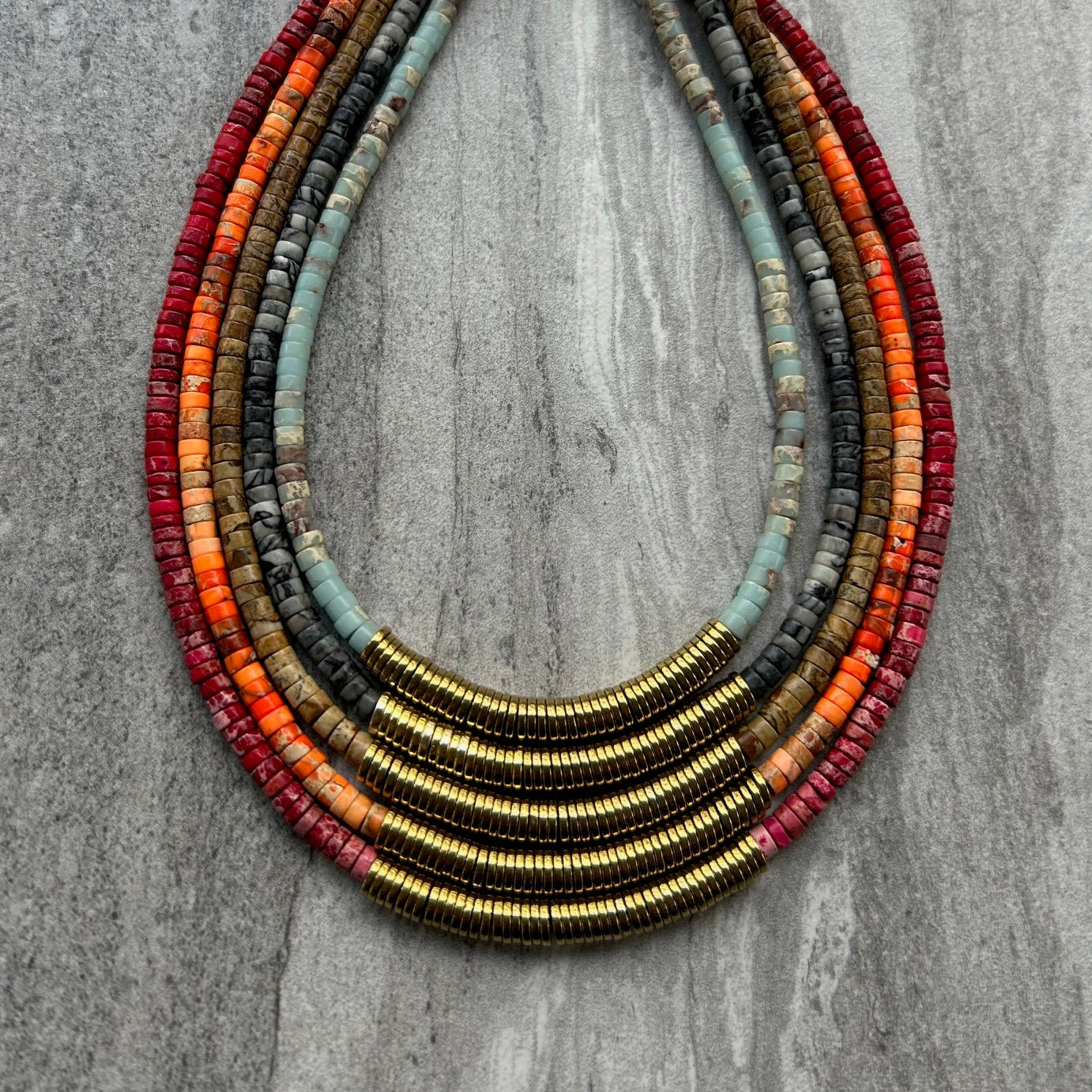 This minimalist collar-style necklace features a natural single strand of Picture Jasper heishi beads, known for their warm earth tones and landscape-like patterns that resemble natural scenery. The design is accented at the front with antique gold plated hematite heishi beads, adding a refined metallic contrast to the organic beauty of the stone.