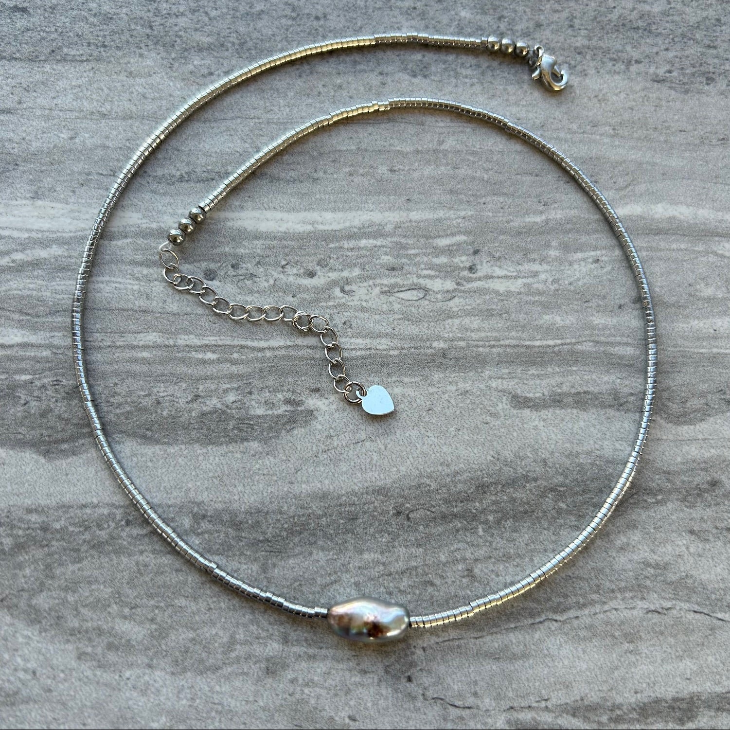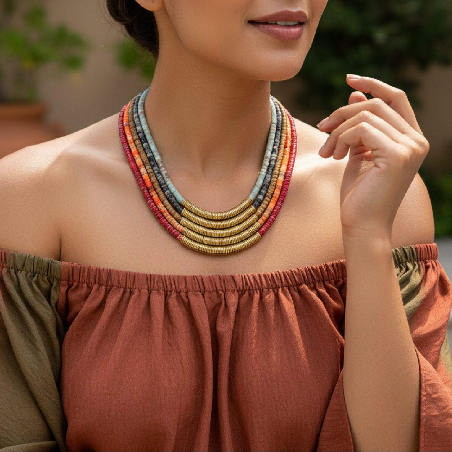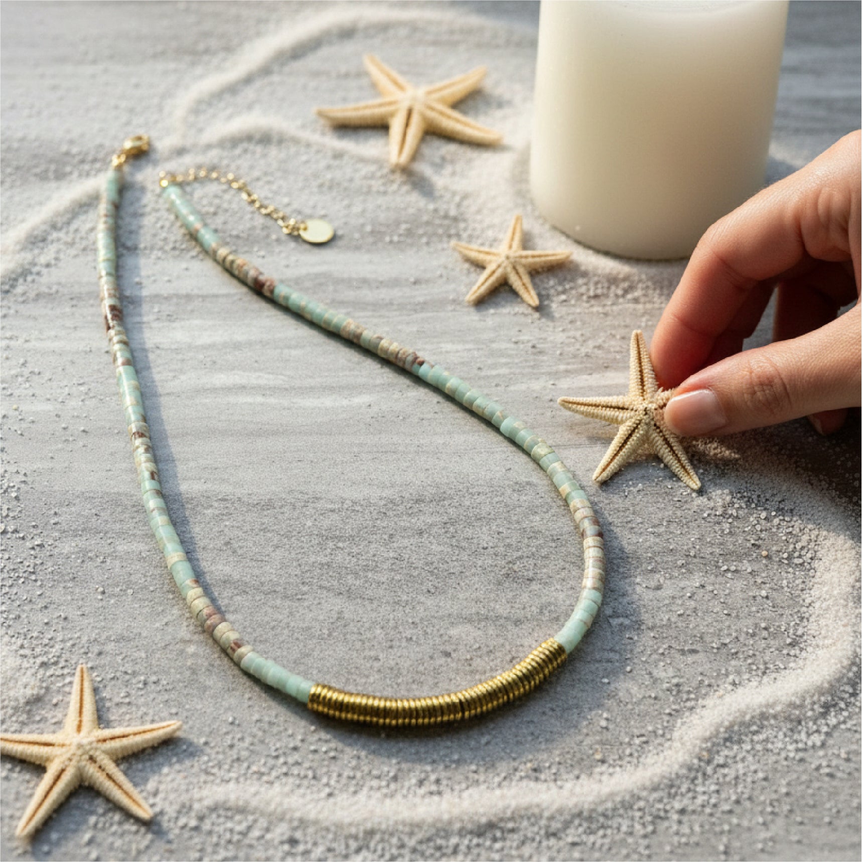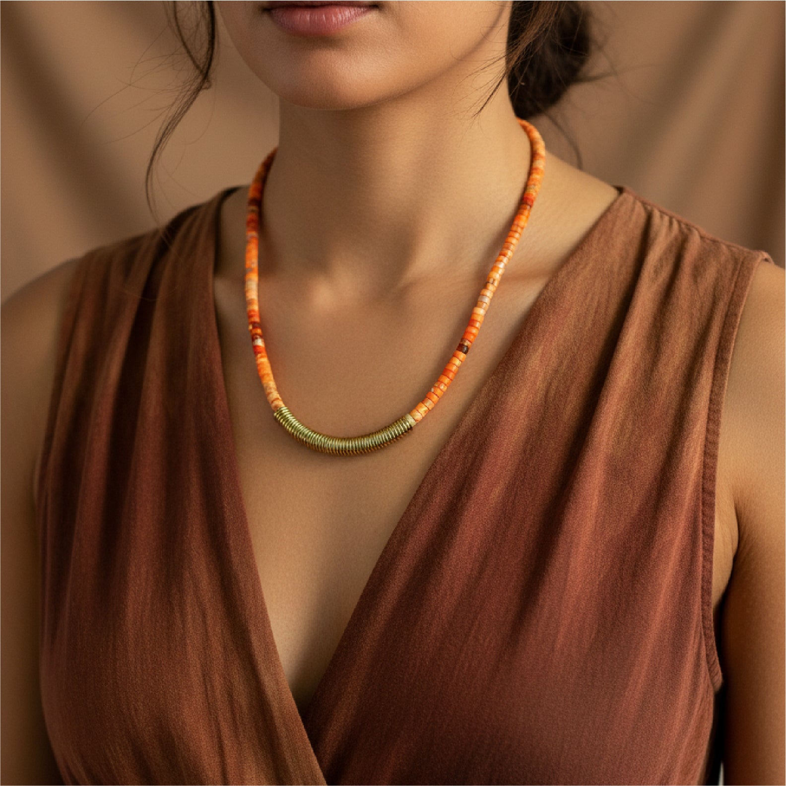 This minimalist collar-style necklace features a natural single strand of Picture Jasper heishi beads, known for their warm earth tones and landscape-like patterns that resemble natural scenery. The design is accented at the front with antique gold plated hematite heishi beads, adding a refined metallic contrast to the organic beauty of the stone.